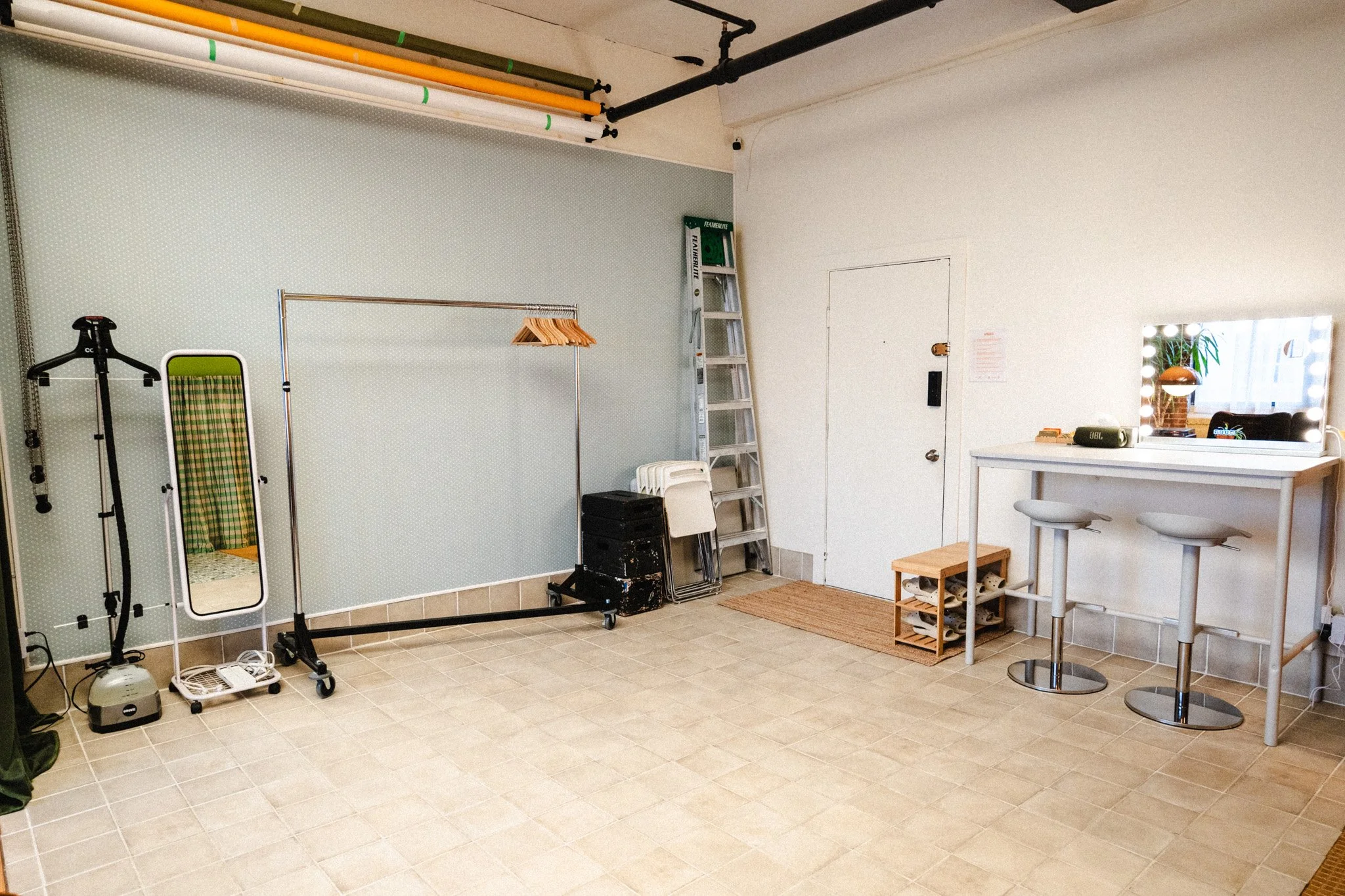 Versatile, cet espace de support offre un comptoir à maquillage, un support à backdrop*, un rack à vêtement, un steamer ainsi que d’autre items pratiques. Le plancher de céramique et le papier peint au mur permettent aussi d’en faire un lieu de création.