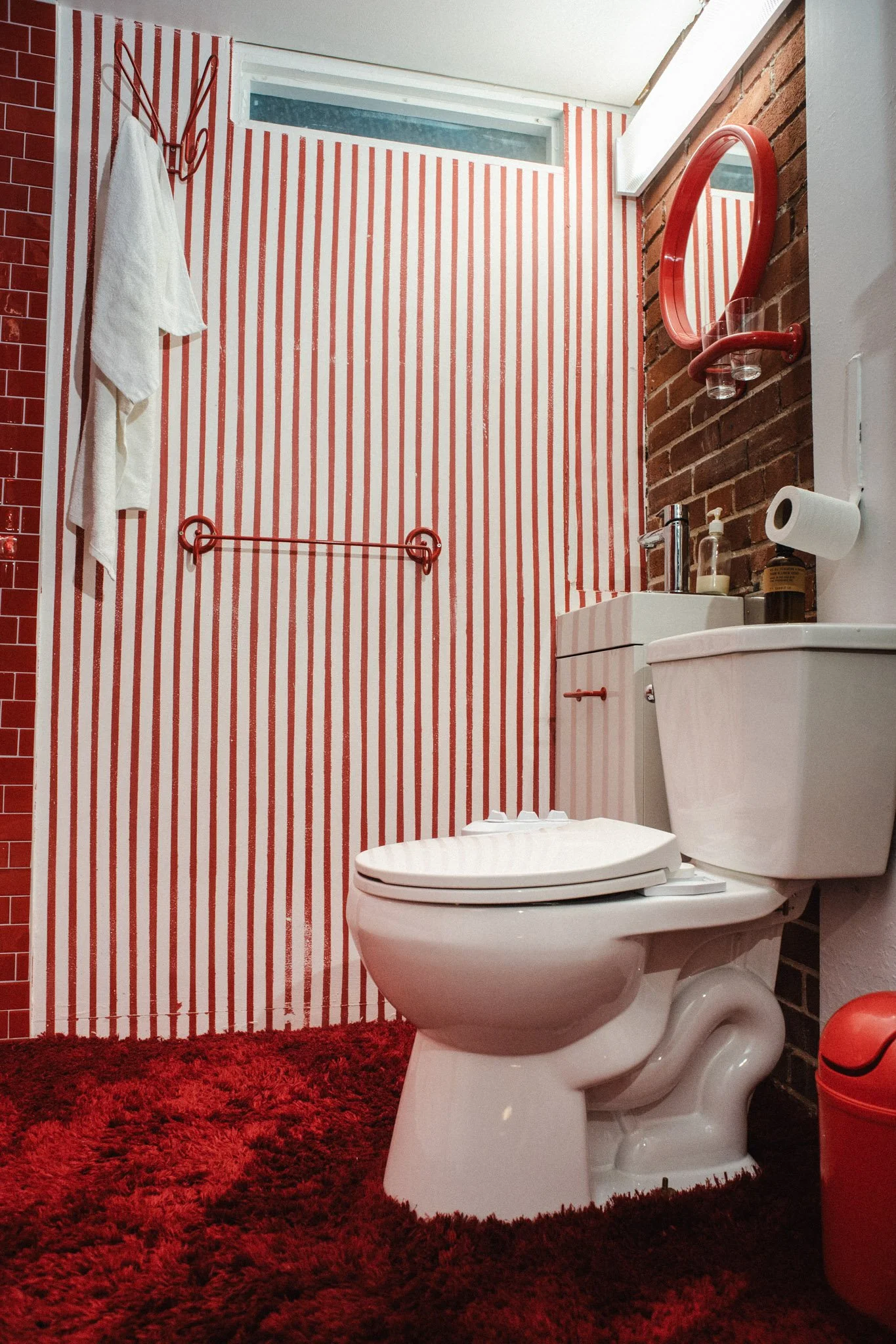 Notre salle de bain monochrome inclut un bain et une toilette fonctionnelle. Avec ses murs saturés et son plancher de tapis, son excentrisme  ne laisse personne indifférent.
