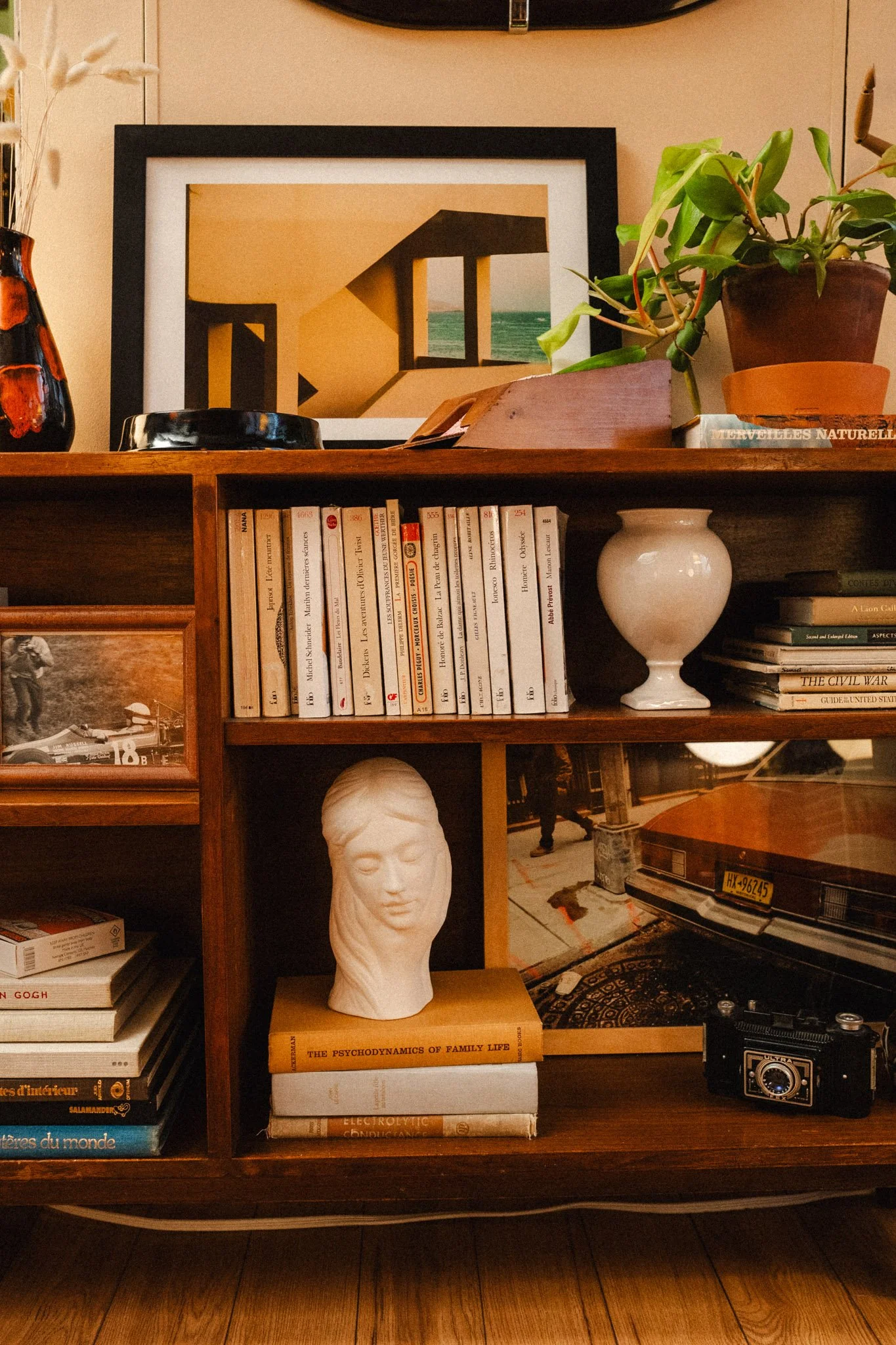 Chaleureux et confortable, le coin lounge agence une tapisserie fleurie et du bois pour offrir une ambiance unique. Le fauteuil ligné et les accessoires vous transportent dans les années 60.